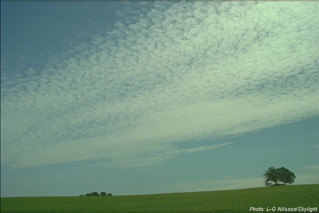 När ett lågtryck och nederbördsområde närmar sig, följs slöjmolnen av skiktmoln som ligger lägre (på 3-7 kilometers höjd) och består av vattendroppar. Solen skiner genom molntäcket som genom en mattglasskiva och snart försvinner den helt bakom det allt tjockare och gråare skiktmolntäcket. Om det ser ut som på den här bilden, är det kanske bara fråga om någon eller några timmar innan nederbörden börjar.
