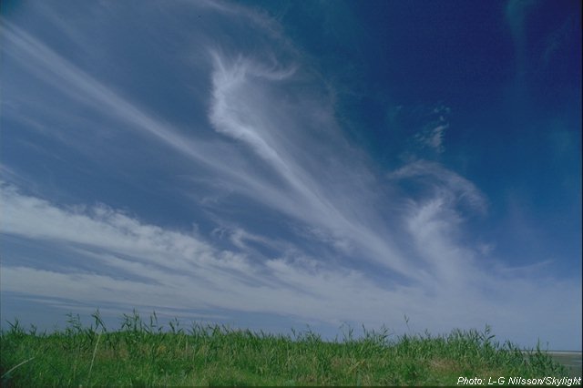 Tunna vita molntrådar som drar upp på en annars klarblå himmel, ser kanske inte så hotfulla ut. Men se upp om trådarna har krokar i änden och tätnar mot horisonten! Fortsätter de att dra upp på himlen, kan det vara ett lågtryck som är på väg. Nederbörden är kanske framme inom ett dygn. Fjädermolnen består av små iskristaller och ligger vanligen på 7-10 kilometers höjd.