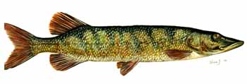 The pike is a member of the Salmon Family (Salmonidae). The pike has an elongated body and a single fin on the back close to the rear end. It has an olive colour with transverse yellow lines on the sides but the tint changes with its place of living. A one metre long pike weighing about 8 kilos is usually around 10 years old. The females are larger than the males which rarely weigh over 6 kilos. The pike is sexually mature about age 2-3. Spawning takes place early in the spring in shallow water. The pike is a predatory fish that eats every kind of fish, even other pikes and sometimes smaller birds and mammals. The pike likes to be in shallow creeks with lush vegetation and often has a favourite place where it waits for prey. The pike can be caught with a lure, casting rod or net.