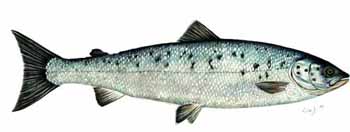 The Atlantic salmon is a bony fish belonging to the Salmon Family (Salmonidae). Elongated, fusiformed body, dark grey back, silver white sides with dark spots. The salmon fry stays for 2-3 years in the river where it was hatched before migrating to sea. It is then about 10-20 cm in size. It stays in the sea for a few years and then returns to spawn in the river where it was born.