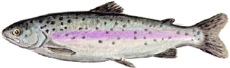 The rainbow trout was brought here from America (via Germany) and is a member of the Salmon Family (Salmonidae). It is recognized by a reddish violet stripe on the middle of the sides. The rainbow trout has spots on its back and tail fins. Its requirements for temperature and water is less rigid than other members of the Salmon Family (Salmonidae) and is therefore easier to breed. A rainbow trout has rather light meat if it has been breeded, free-range rainbow trouts quickly develop more red meat and darker skin. In later years more and more fish breeding have started up and the rainbow, as it is commonly called, has become a popular dish. Rainbow trout is marketed under several different names. It is related in some way with most other members of the Salmon Family (Salmonidae) but mostly with the common salmon trout.