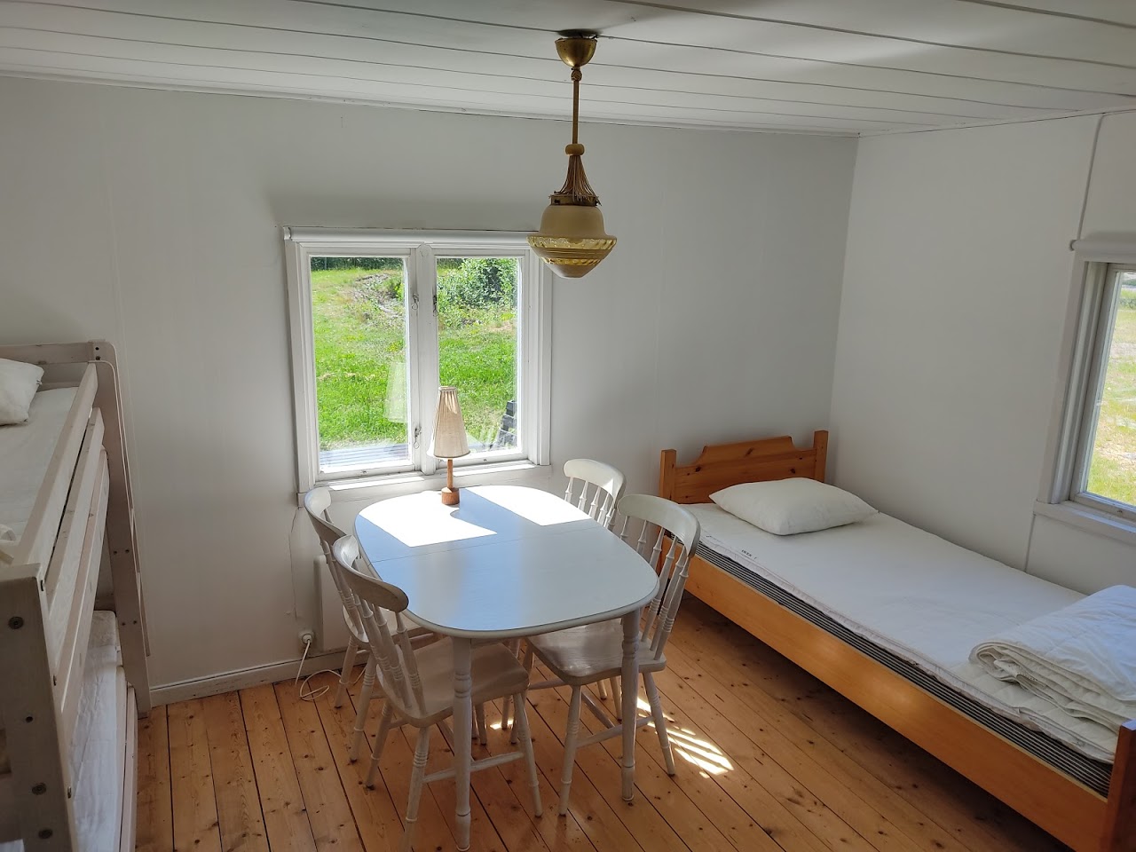Stuga med en enkelsäng och en våningssäng. Köksdel med kyl och frys, spis med ugn. Toalett med dusch. Stugan ligger nära handelsboden ca 100 m från hamnen.